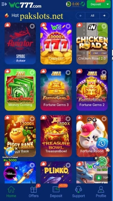 WC777 Game is an online earning application where users can play different slots types and arcade games to earn real money. The app includes popular games like Teen Patti, Dragon Tiger, Color Game, Slot Machines, and more. Every game gives you a chance to win rewards that can later be withdrawn through JazzCash or Easypaisa.